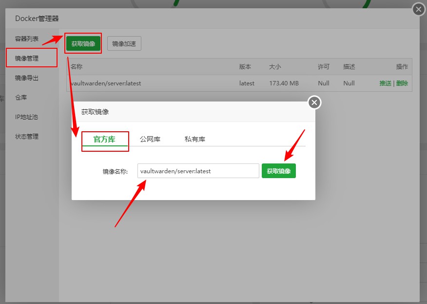 2-2、调试完毕宝塔的基础设置后,打开Docker管理器,开始下载Bitwarden镜像文件,如下图所示: