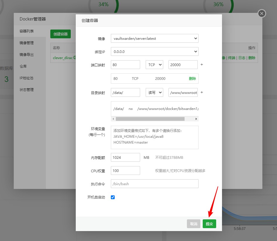 2-3、然后点击 容器列表 ,再 创建容器,开始添加Bitwarden,如下图所示: