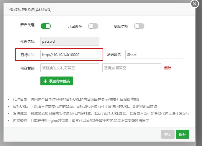 2-6、然后打开刚刚创建的网站的设置,选择到反向代理,把Docker容器的页面地址写入进去,如下图所示: