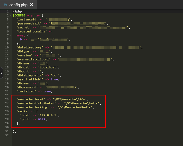 'memcache.local' => '\OC\Memcache\APCu', 'memcache.distributed' => '\OC\Memcache\Redis', 'memcache.locking' => '\OC\Memcache\Redis', 'redis' => [ 'host' => '127.0.0.1', 'port' => 6379, ],
