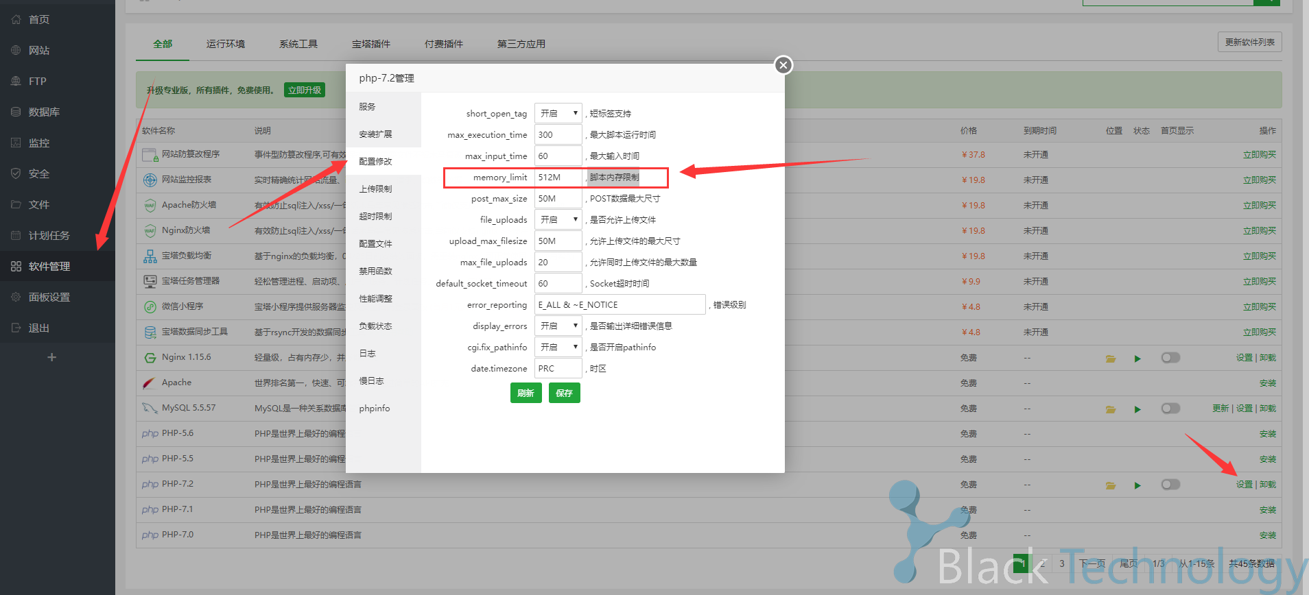点击–>PHP 7.3–>设置–>配置修改–>把memory_limit选项值写为:1024MB(512MB以上即可,512MB也行)–>保存–>完成