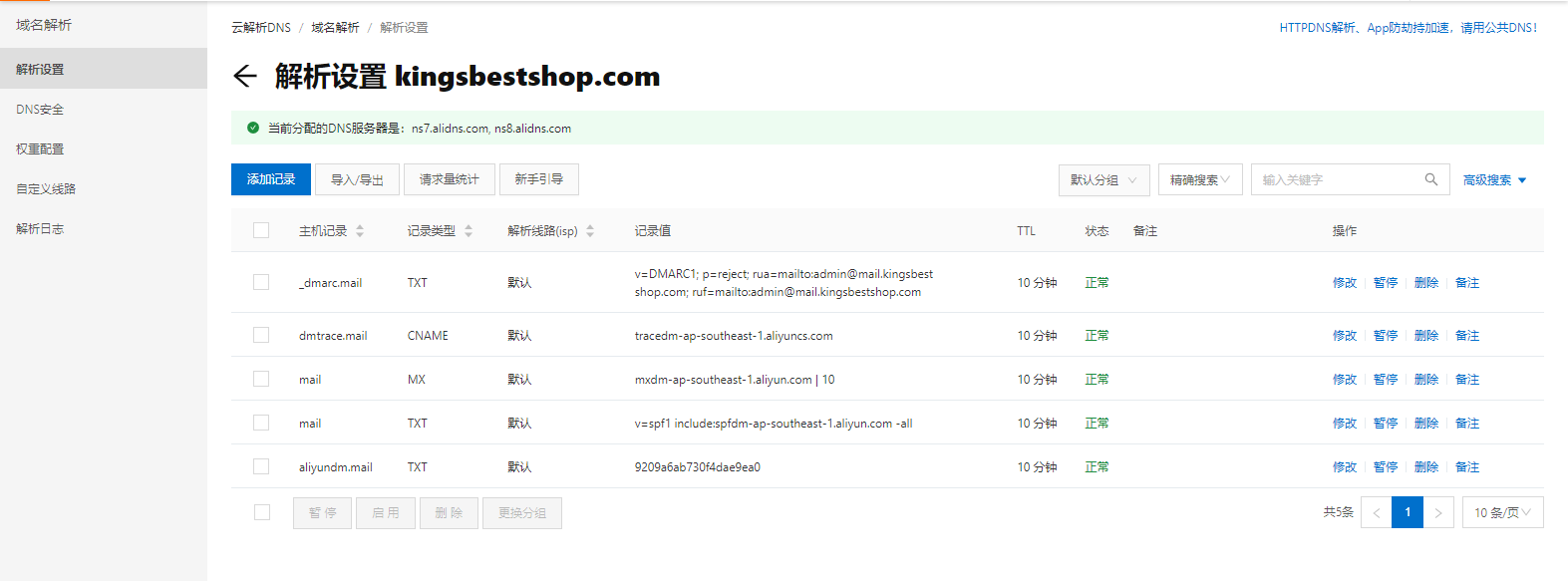 二、设置完成后等待20-30min让解析生效,如果验证全部通过则第一步设置完成。