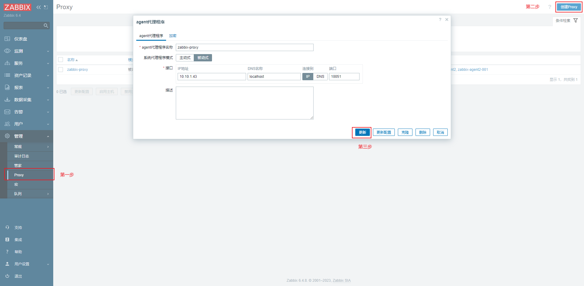 1.登录zabbix管理后台,首先添加proxy代理,选择被动式。