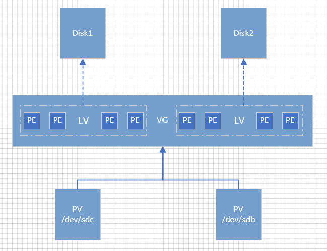- PV —-> VG(PE,需这里指定大小) —-> LV