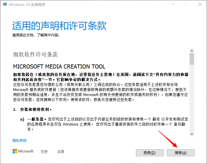 1-2、打开下载完毕的程序,选择接受“适用的声明和许可条款”: